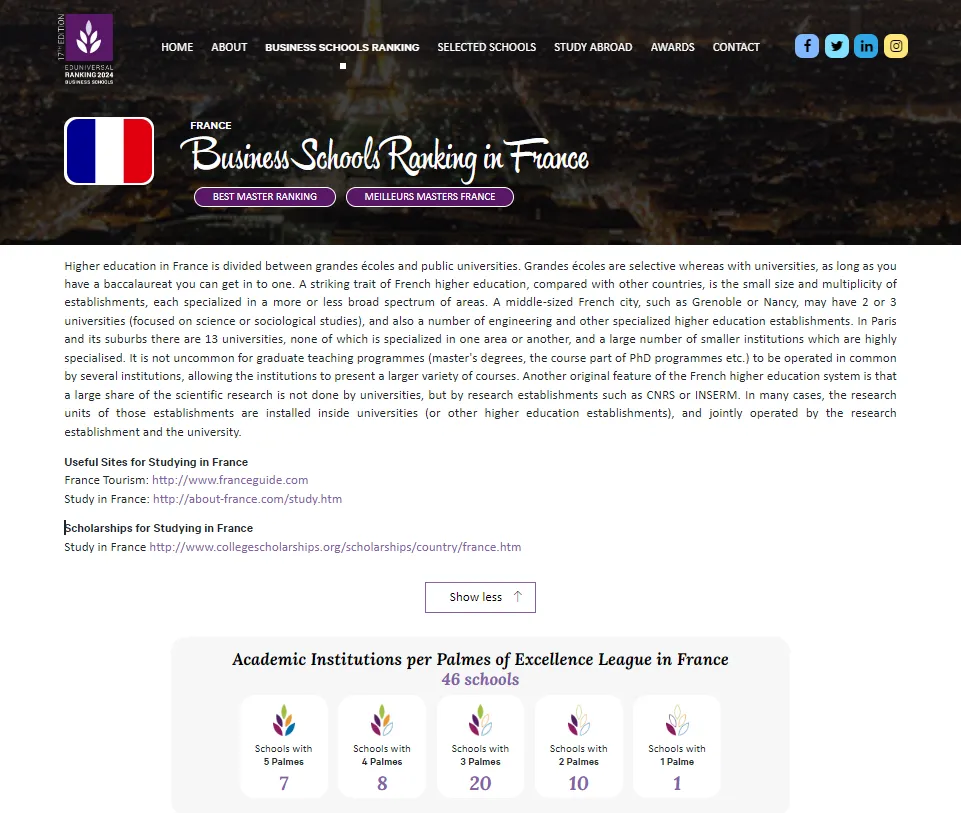 在全球权威商科排名机构 Eduniversal(环球教育)全球最佳商学院排名中,克莱蒙高等商学院获得三片金棕榈奖,连续多年三片棕榈叶标志其为拥有强大的国际影响力的杰出商学院。