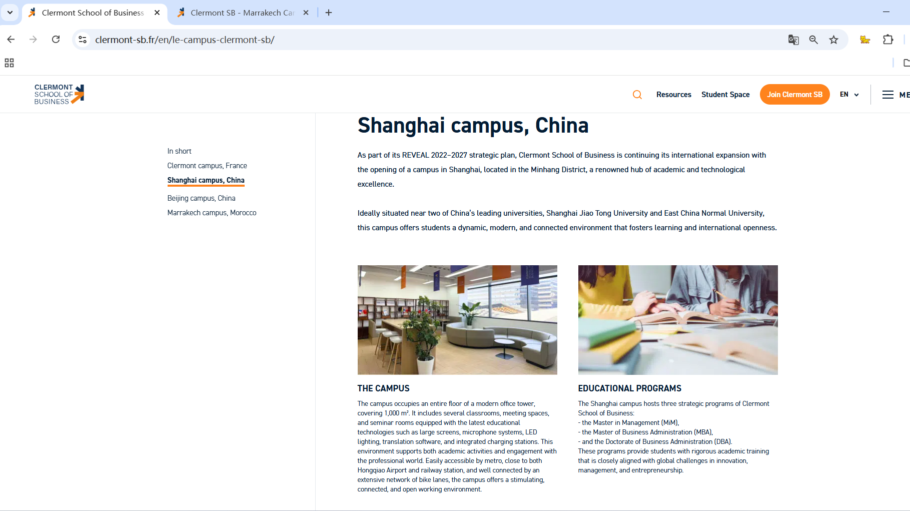 为确保全球学生、合作伙伴及公众能够获取最权威、最全面的信息,法国克莱蒙高等商学院已在官方网站(网址:https://www.clermont-sb.fr/en/le-campus-clermont-sb/)特别设立了“上海分校”专属板块。该板块不仅是信息的集散地,更是我们透明化运营和全球化战略的窗口。