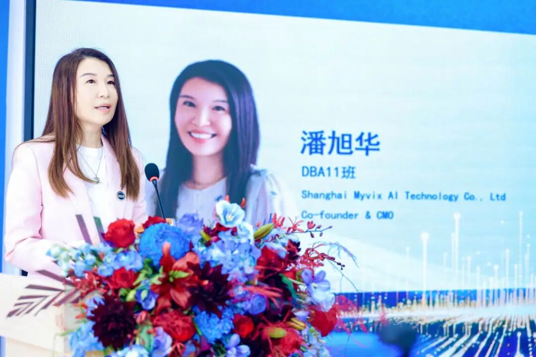 DBA11班新生代表潘旭华(Shanghai Myvix AI Technology Co., Ltd Co-founder & CMO)的发言充满了学者的思辨与AI时代创业者的格局。她通过分享AI案例敏锐地提出,人类不用担心被AI取代,因为人类的经验、智慧和情感是最宝贵的。