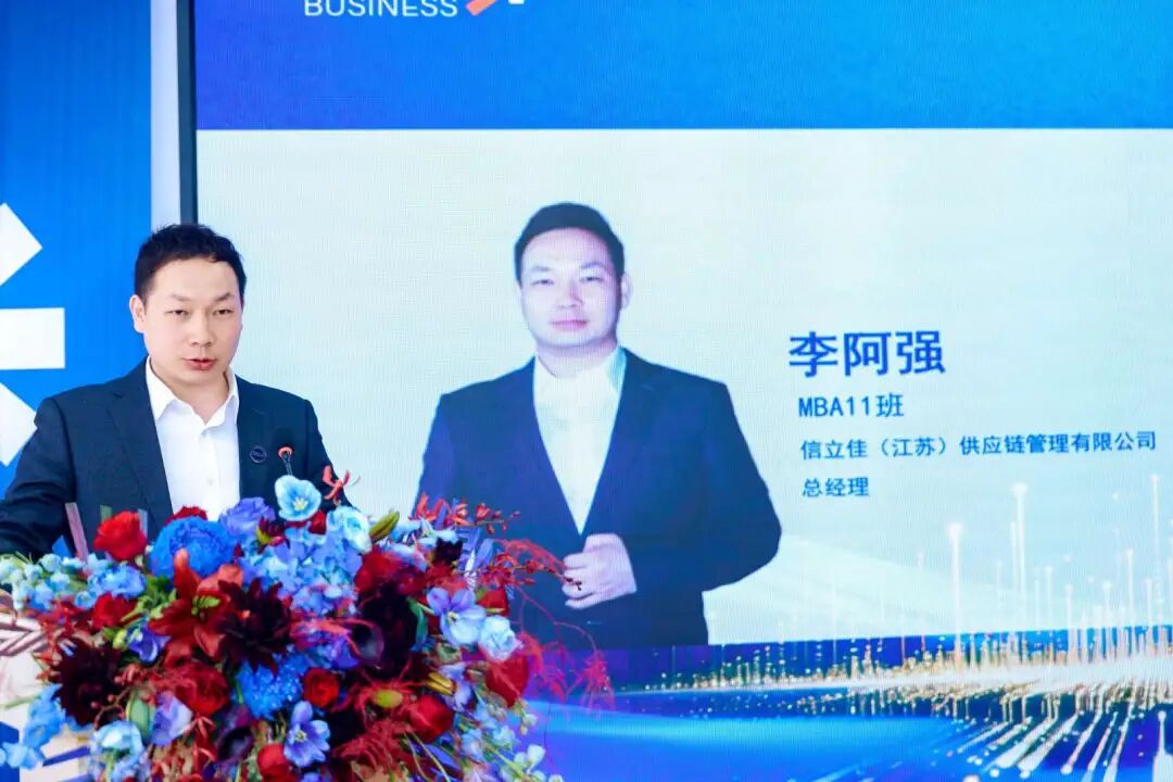 MBA11班新生代表李阿强(信立佳江苏供应链管理有限公司-总经理),分享了他在瞬息万变的市场环境下,深耕供应链领域的企业经营者选择重启求学之路的初衷,并代表全体新生郑重承诺:将以空杯心态勤学笃行,认真汲取知识;珍惜同窗情谊,互帮互助;更会坚持学以致用,把课堂所学融入实际工作,做到知行合一,不负韶华与相遇。