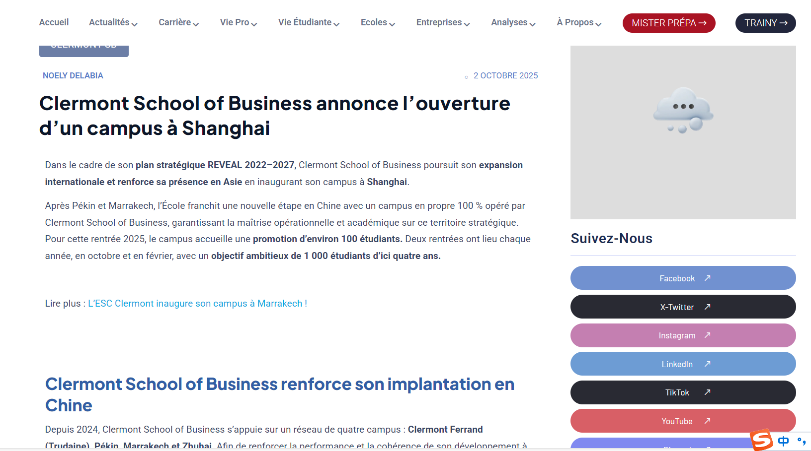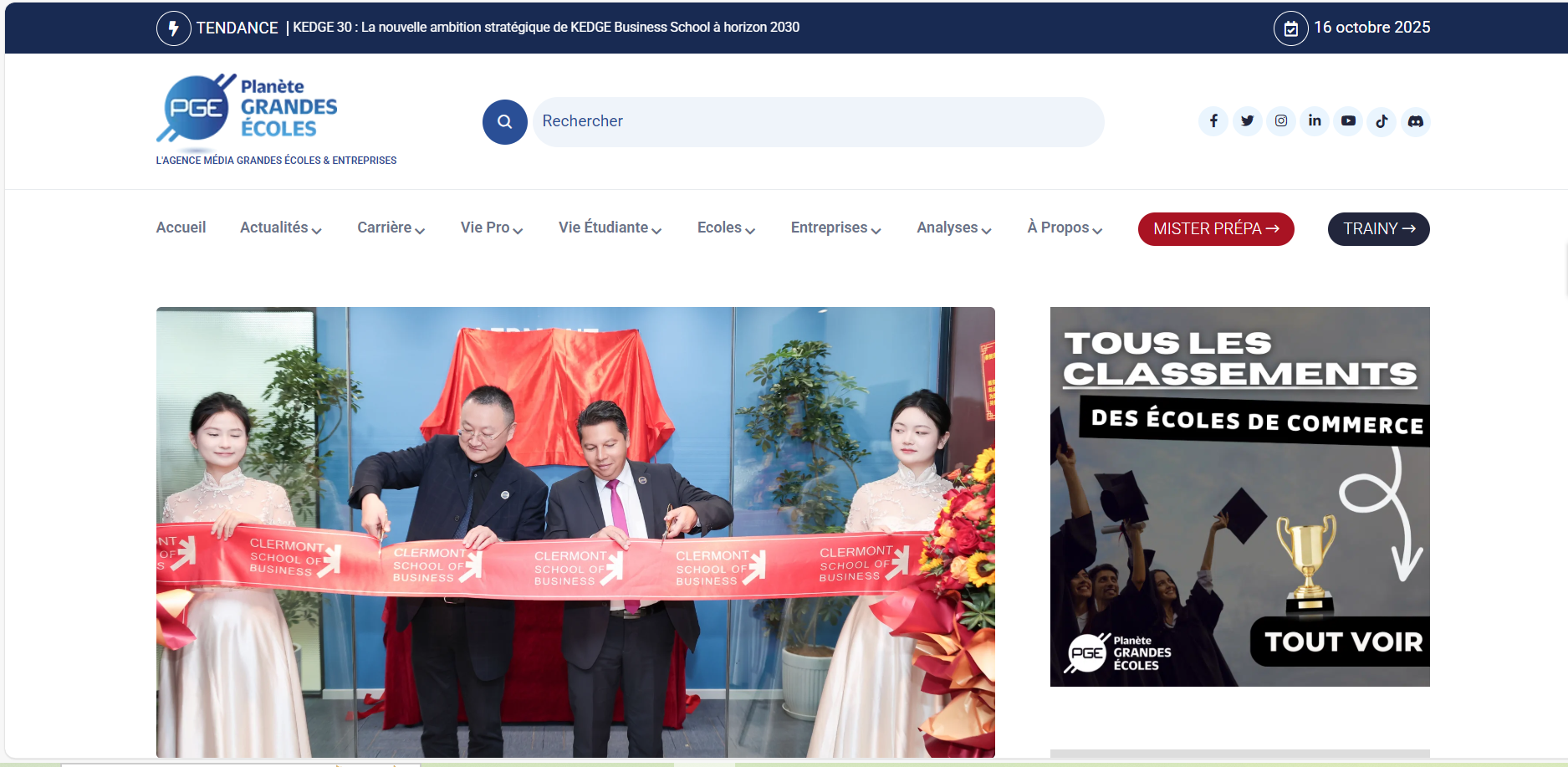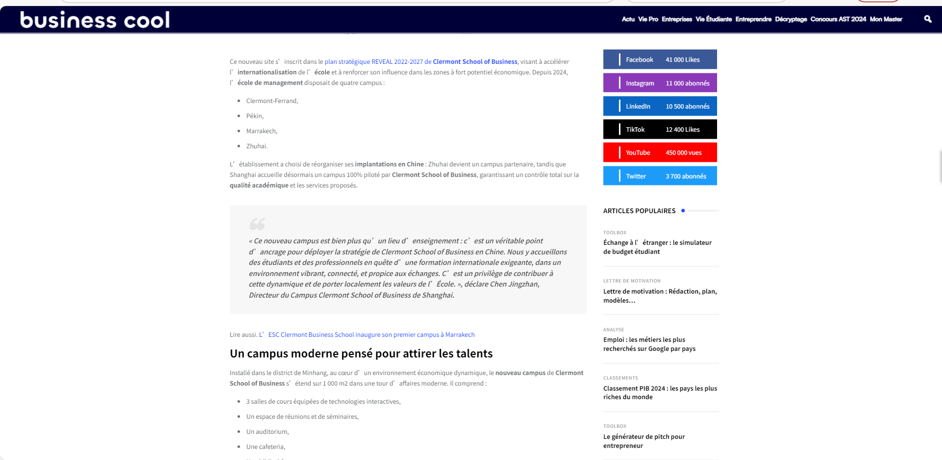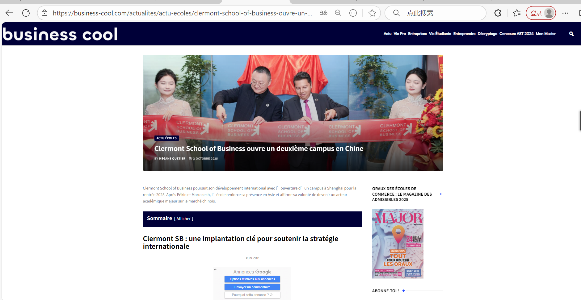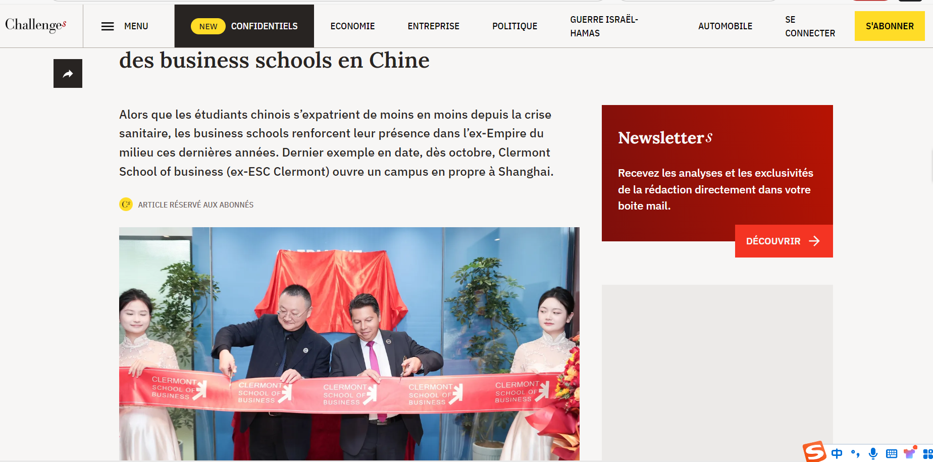 近日,法国克莱蒙高等商学院在上海设立分校的重大举措,引发了法国媒体的广泛关注和深度报道。包括《business-cool》、顶尖商业媒体《Challenges》及知名高等教育媒体《Planète Grandes Écoles》在内的多家权威媒体,纷纷对此进行专题报导。